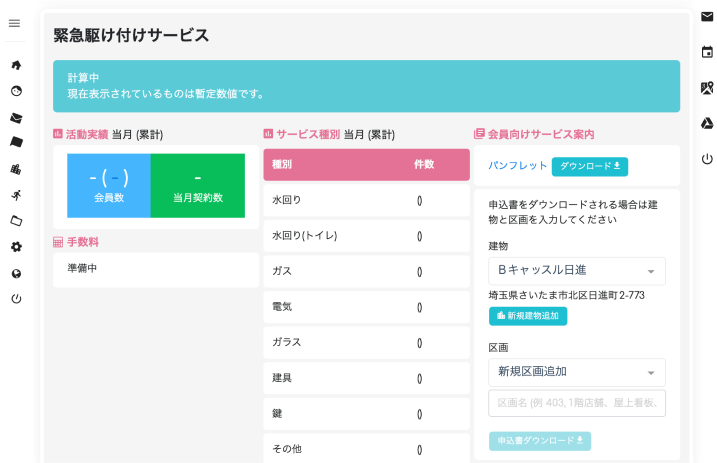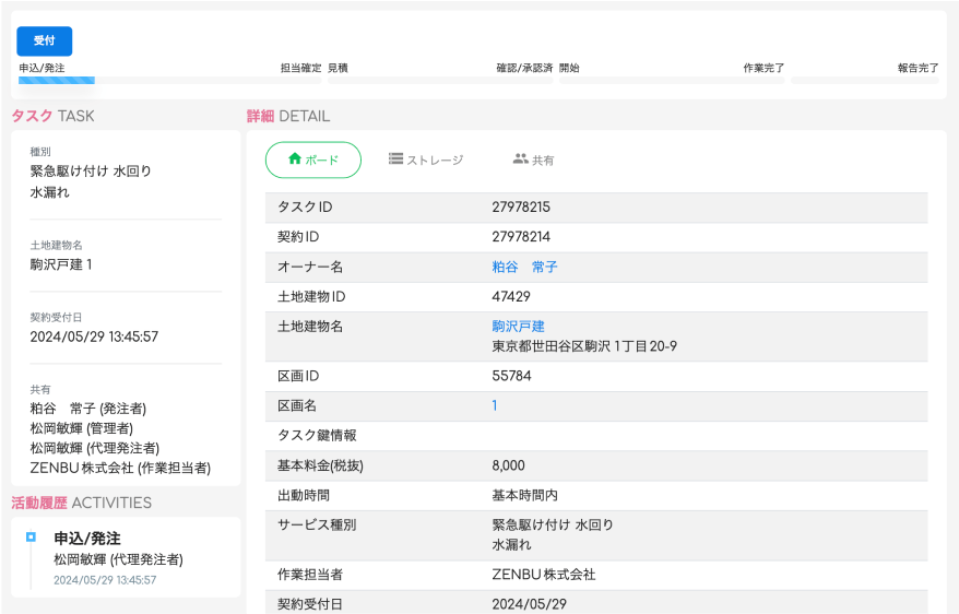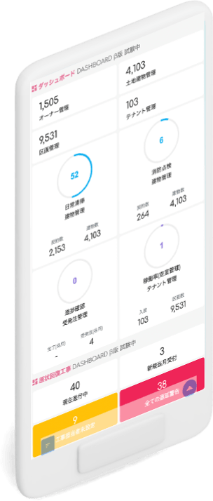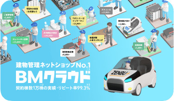 設備トラブル受付から出動手配(ネットショップ)→ワークフロー管理→修繕見積・承認フロー→電子契約→報告→建物カルテ→請求管理まで一気通貫。